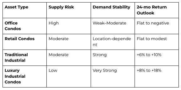 The asset class is expected to outperform conventional condos and keep pace with well-located light industrial, supported by limited supply, ownership psychology, and inflation-hedging characteristics.