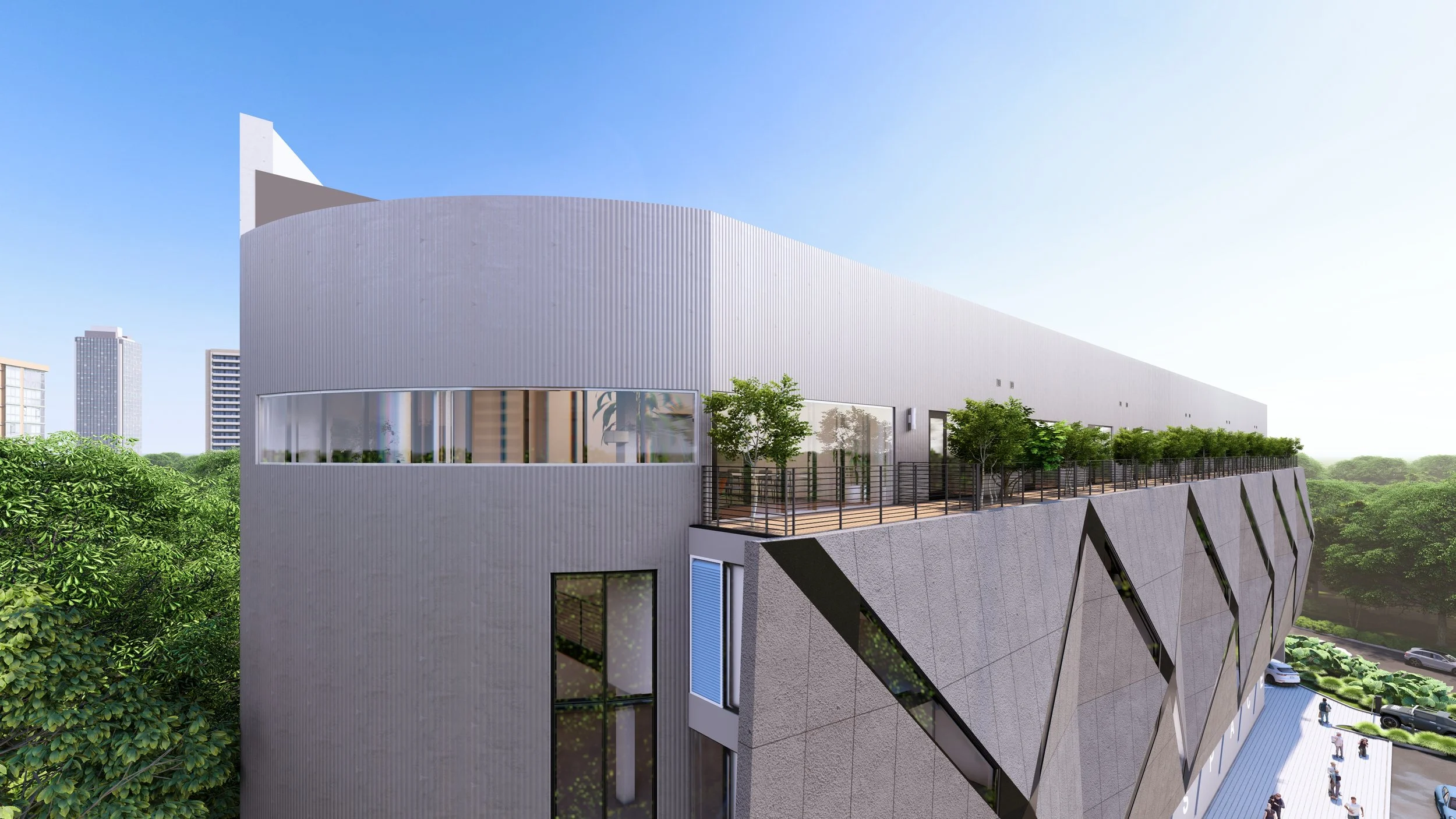 Rooftop lounge with views of Downtown, Uptown, and Memorial Park Houston | Chef’s kitchen | A/V setup | Conference rooms