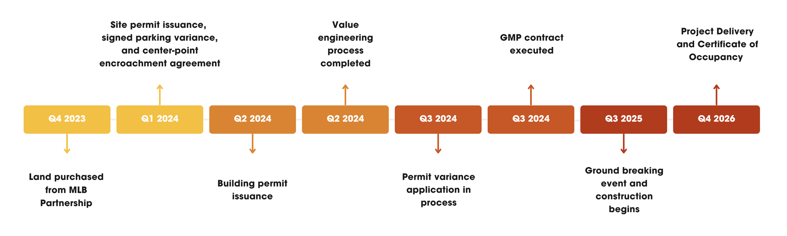June 2024 marked the project's permit approval for both site and building. The team is currently mobilizing resources in parallel with our project in The Woodlands with Howard Hughes.
